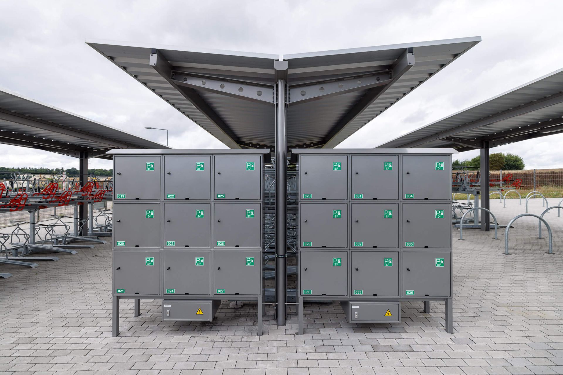 BETA EnergySafe als Ergänzungsmodul im Baukasten für BETA-Fahrradständer, bestehend aus kundenseits zu bestimmender Anzahl an Schließfächern, integriert in stabilen Rohrrahmen.