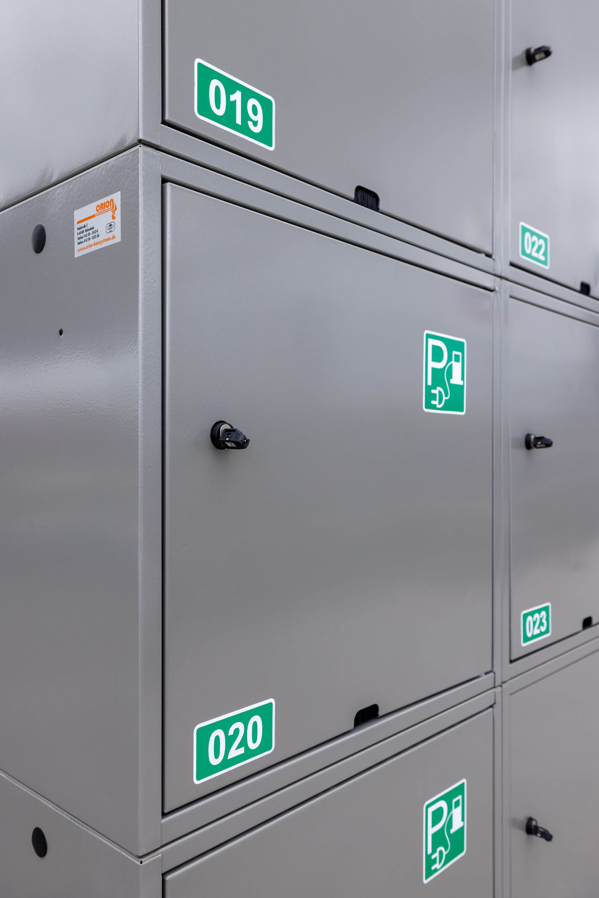 Schließfachgehäuse, hergestellt aus stabilem feuerverzinkten Stahlblech, Materialdicke 1,0 mm, abschließend pulverbeschichtet im RAL-Farbton nach Vorgaben des Auftraggebers, Türelement mit 2 Stück stabilen Scharnieren, 1 x Einsteckschloss, 1 x Schließzylinder (je Fach verschieden schließend), ca. mittig in Unterkasten des Türrahmens ausgeklinkte Öffnung, abgedichtet mit Gummilippe zur quetschfreien Durchführung von Kabeln im Falle der Abwicklung des Ladevorganges bei Verbleib des Akkus außerhalb des Safemodules (am Fahrrad).
