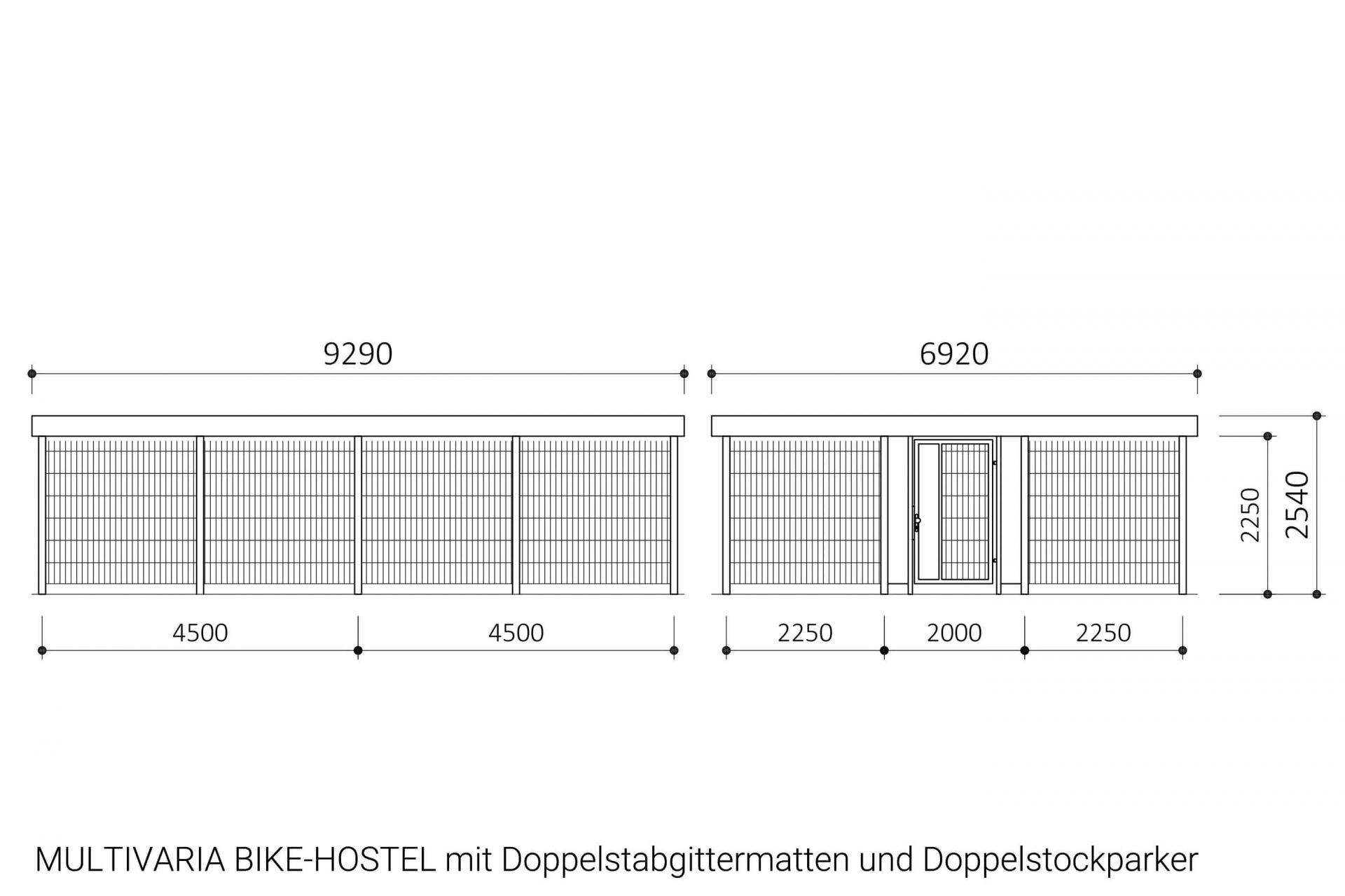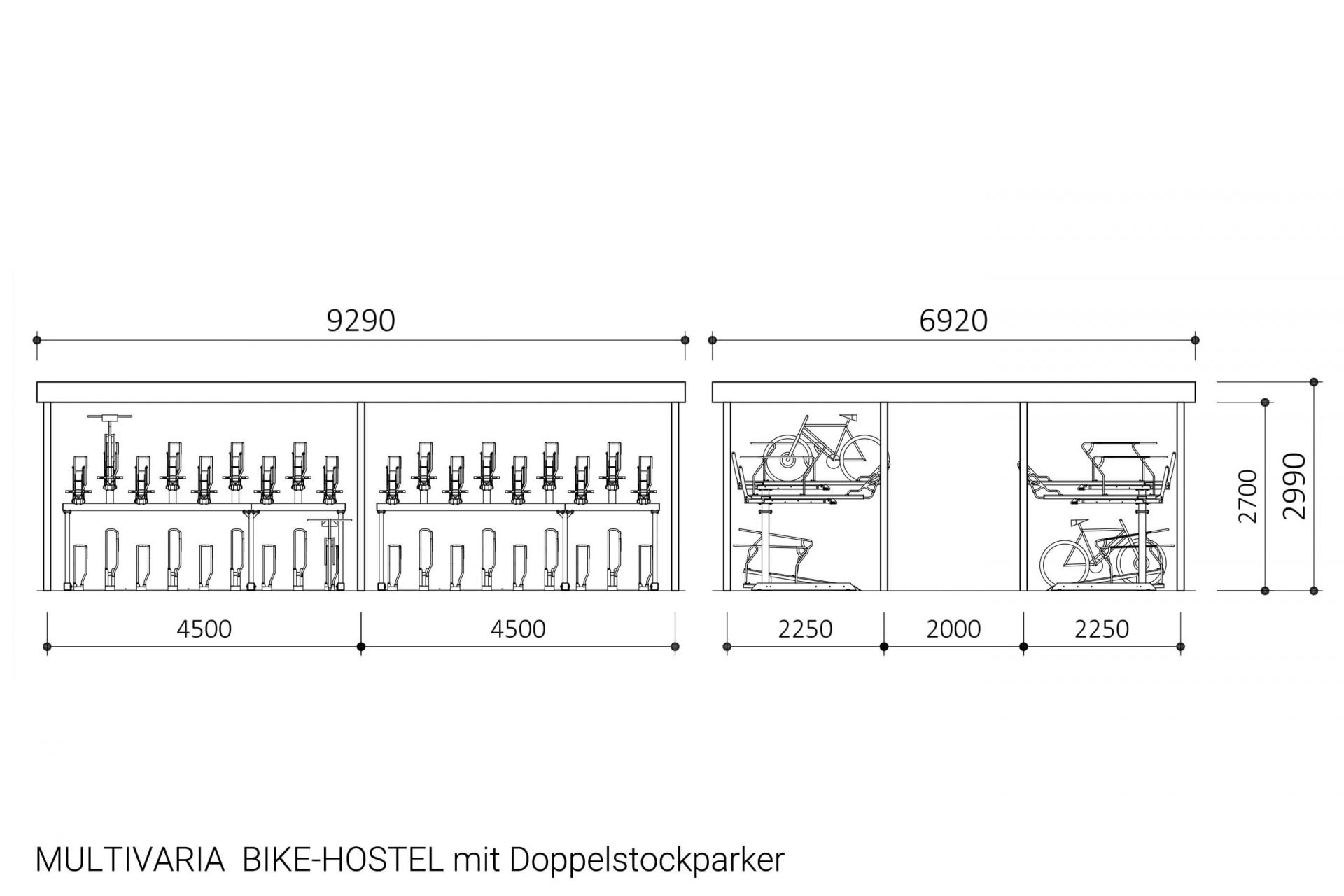 | MULTIVARIA BIKE-HOSTEL mit Fahrradparker BETA XXL | MULTIVARIA BIKE-HOSTEL mit Fahrradparker Doppelstockparker | |
