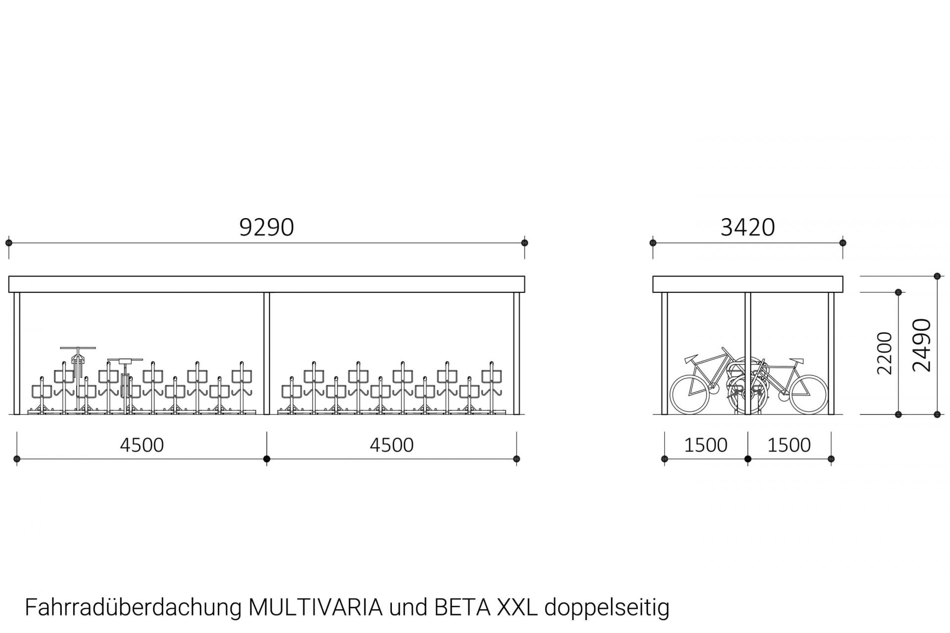 Wenn Abstellkapazität zur Herausforderung wird, schafft der Fahrradunterstand MULTIVARIA mit doppelseitigem BETA XXL Fahrradständer mehr Ordnung auf gleicher Fläche. Die Dachtiefe von 3420 mm ermöglicht eine beidseitige Nutzung und führt zu einer deutlich höheren Stellplatzzahl pro laufendem Meter. Die stabile Flachdachkonstruktion mit 290-mm-Attika, verdeckten Verschraubungen und integrierter Entwässerung erfüllt höchste technische Anforderungen.