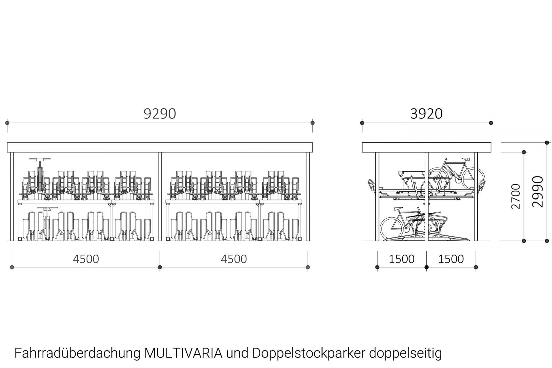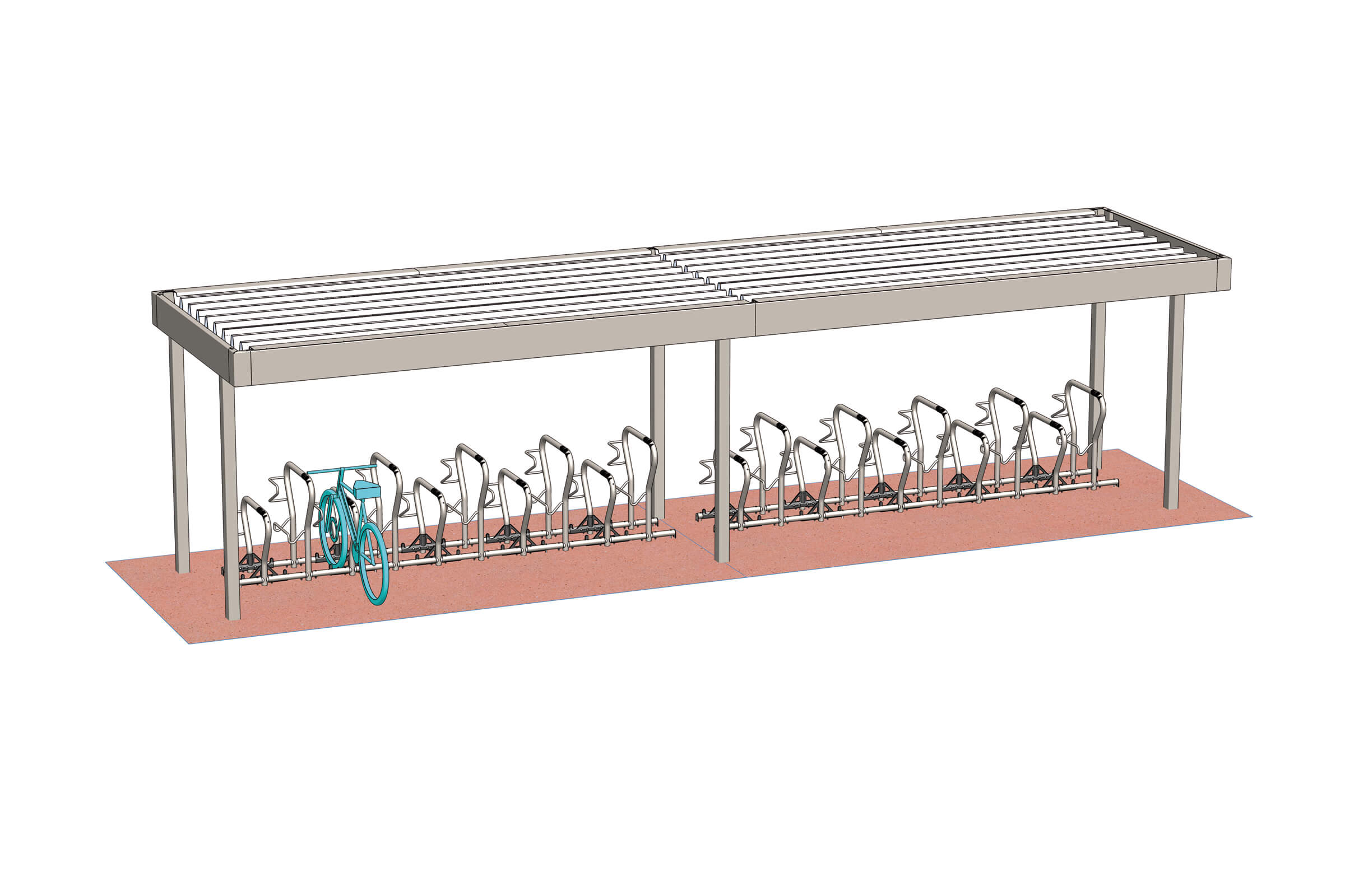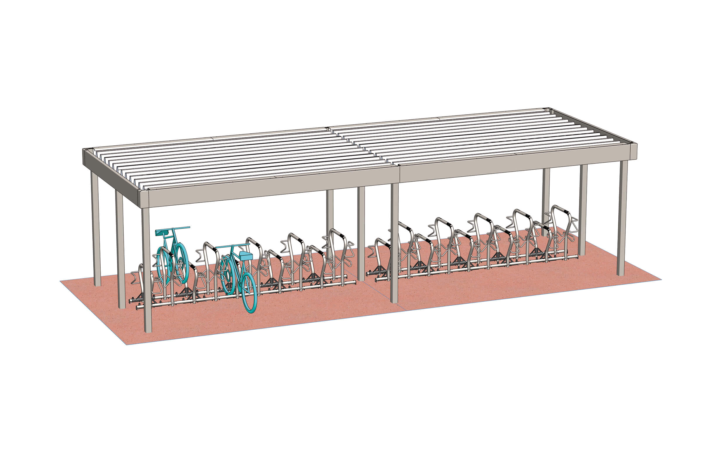 Der Fahrradunterstand MULTIVARIA mit Doppelstockparker nutzt die Dachfläche vollständig aus und ermöglicht beidseitige Doppelstock-Belegung. Mit einer Dachtiefe von 3920 mm und einer Durchgangshöhe von 2700 mm entstehen hochleistungsfähige Fahrradstationen, die pro Element bis zu 34–68 Stellplätze ermöglichen. Ideal für Verkehrsbetriebe, Behörden und große Campusflächen.