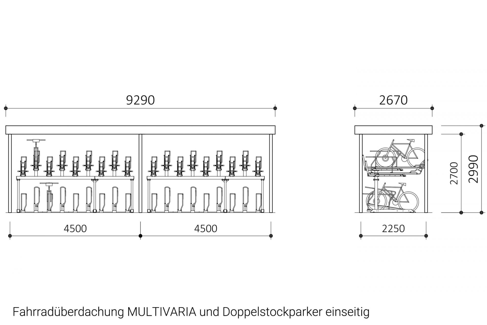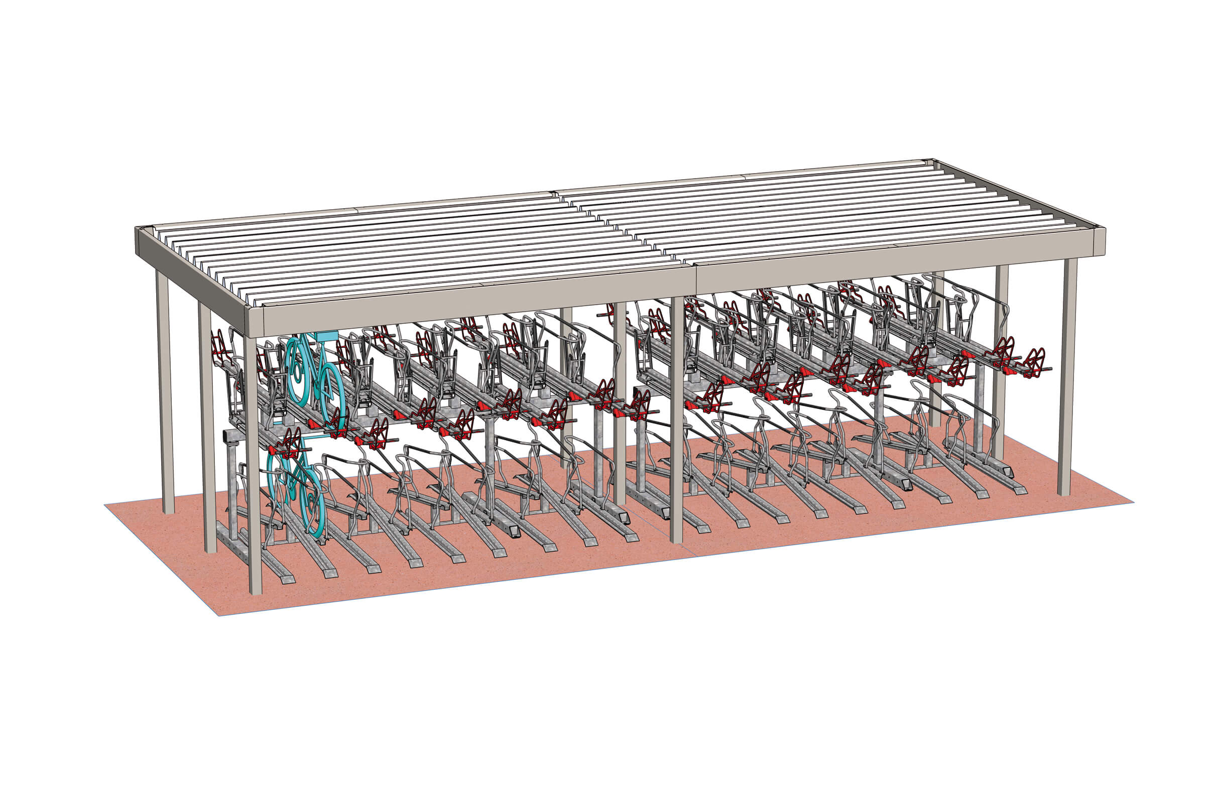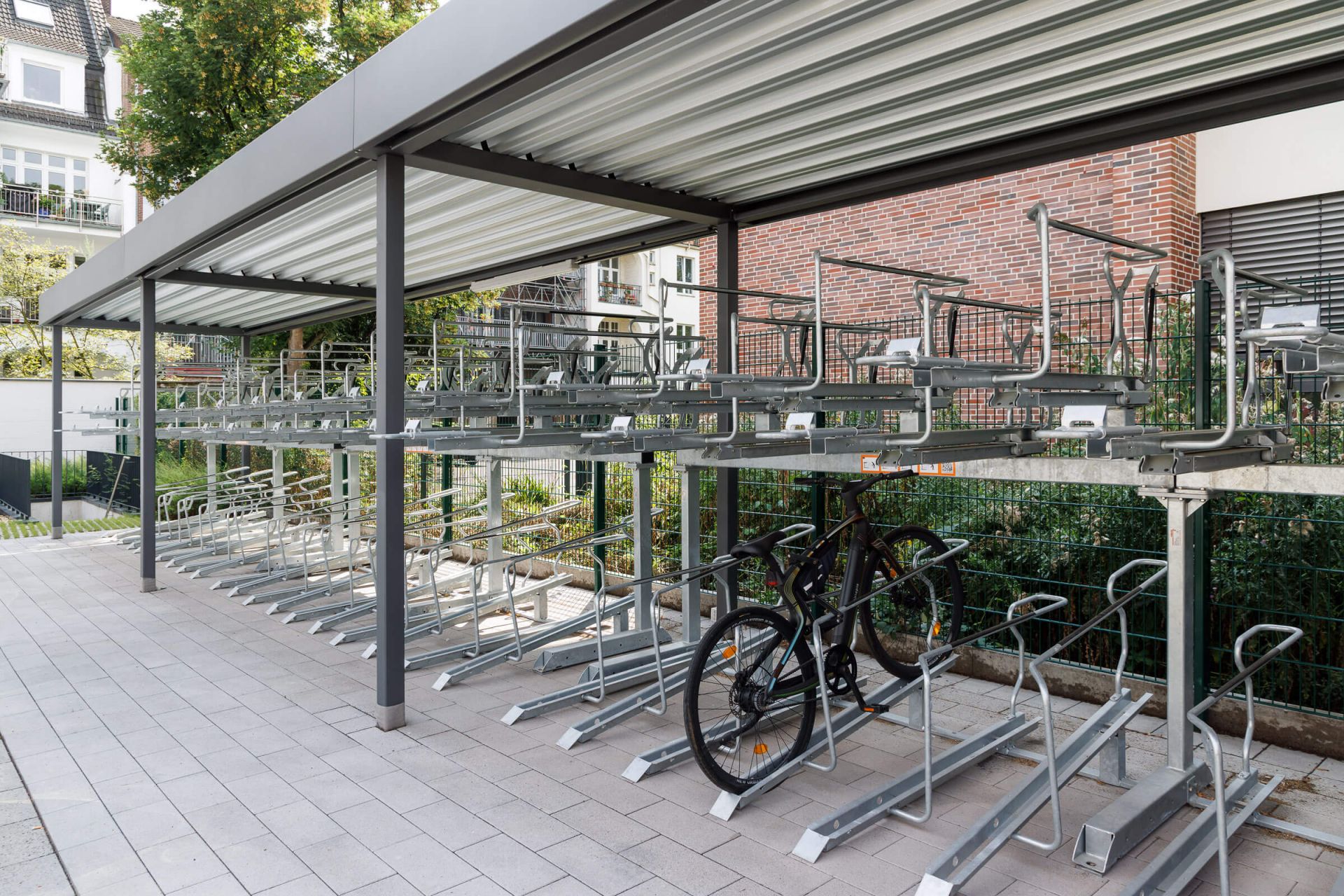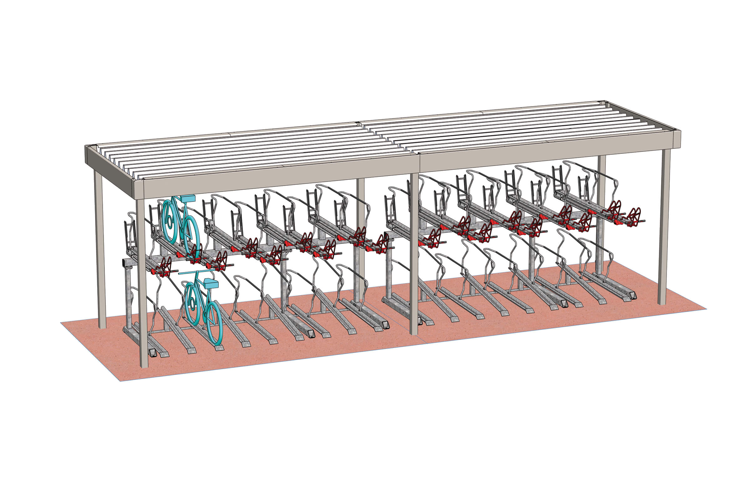 Platzmangel bremst oft moderne Mobilitätskonzepte aus. Der Fahrradunterstand MULTIVARIA mit Doppelstockparker ermöglicht eine Verdopplung der Stellplätze auf minimaler Fläche. Mit einer Durchgangshöhe von 2700 mm erfüllt die Anlage die technischen Anforderungen für Doppelstock-Systeme.